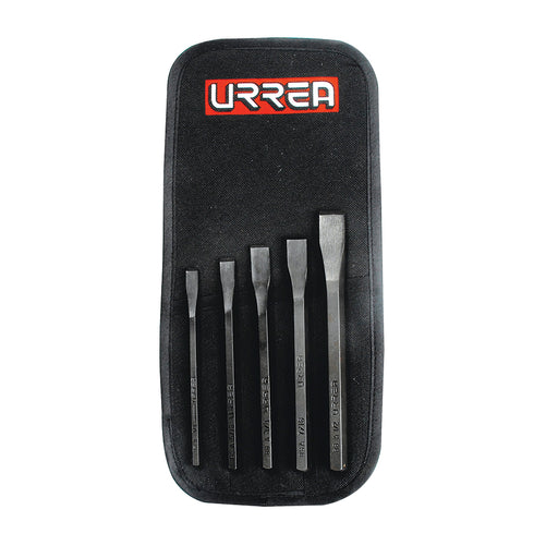 -Juego de 5 cinceles 1/4"-1/2" Urrea -Fabricados en acero microaleado para mayor resistencia. -El extremo contrario a la punta está diseñado para s...