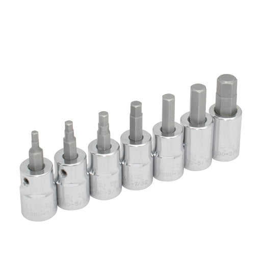 -Juego de 7 dados punta hexagonal en pulgadas en riel Urrea -Dados con punta hexagonal de 1/8" a 3/8" cuadro 3/8" en riel y clips en blíster.