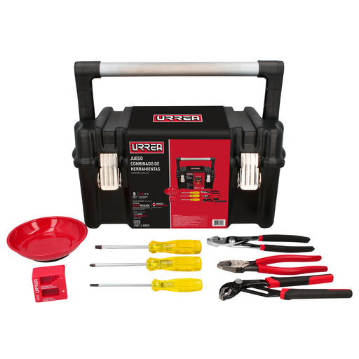 Ver todos los detalles-Contenido: Martillo de uña mango tubular 13oz. Pinza de electricista 6". Pinza punta larga 6". Pinza diagonal de corte 6". Llave ajustable 6". Niv...