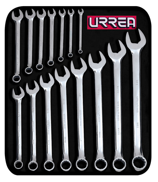 Juego de llaves combinadas pulido espejo en pulgadas, 12 puntas, 15 pz en estuche Urrea