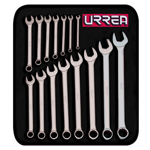 Juego de llaves combinadas satinadas métricas, 12 puntas, 15 piezas en estuche Urrea