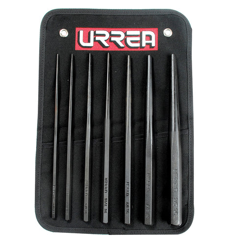 -Juego de 7 punzones guías botadores largos Urrea -Punta cónica ideal para instalar y remover pasadores y guías de centro en agujeros profundos. -F...