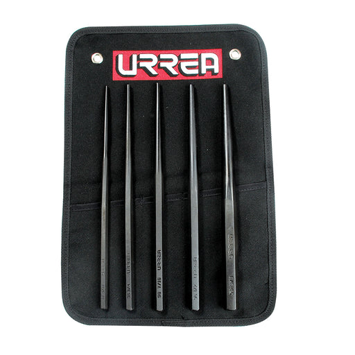 -Juego de 5 punzones guías botadores largos Urrea -Punta cónica ideal para instalar y remover pasadores y guías de centro en agujeros profundos. -F...