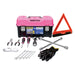 -14 herramientas de mayor uso en trabajos básicos de mantenimiento y reparación de un automóvil. Terminados en color rosa con resistente caja plástica de 17" con broches metálicos.